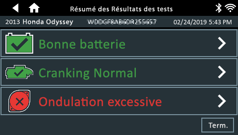 8. Ensuite, vous pouvez sélectionner Envoyer les résultats pour imprimer ou envoyer le résultat du test par e-mail, sélectionner Test du système pour exécuter un test du démarreur et de l’alternateur, ou sélectionner Terminé pour revenir au menu principal.